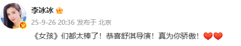 随后,李冰冰发文祝贺:“《女孩》们都太棒了!恭喜舒淇导演!真为你骄傲!”